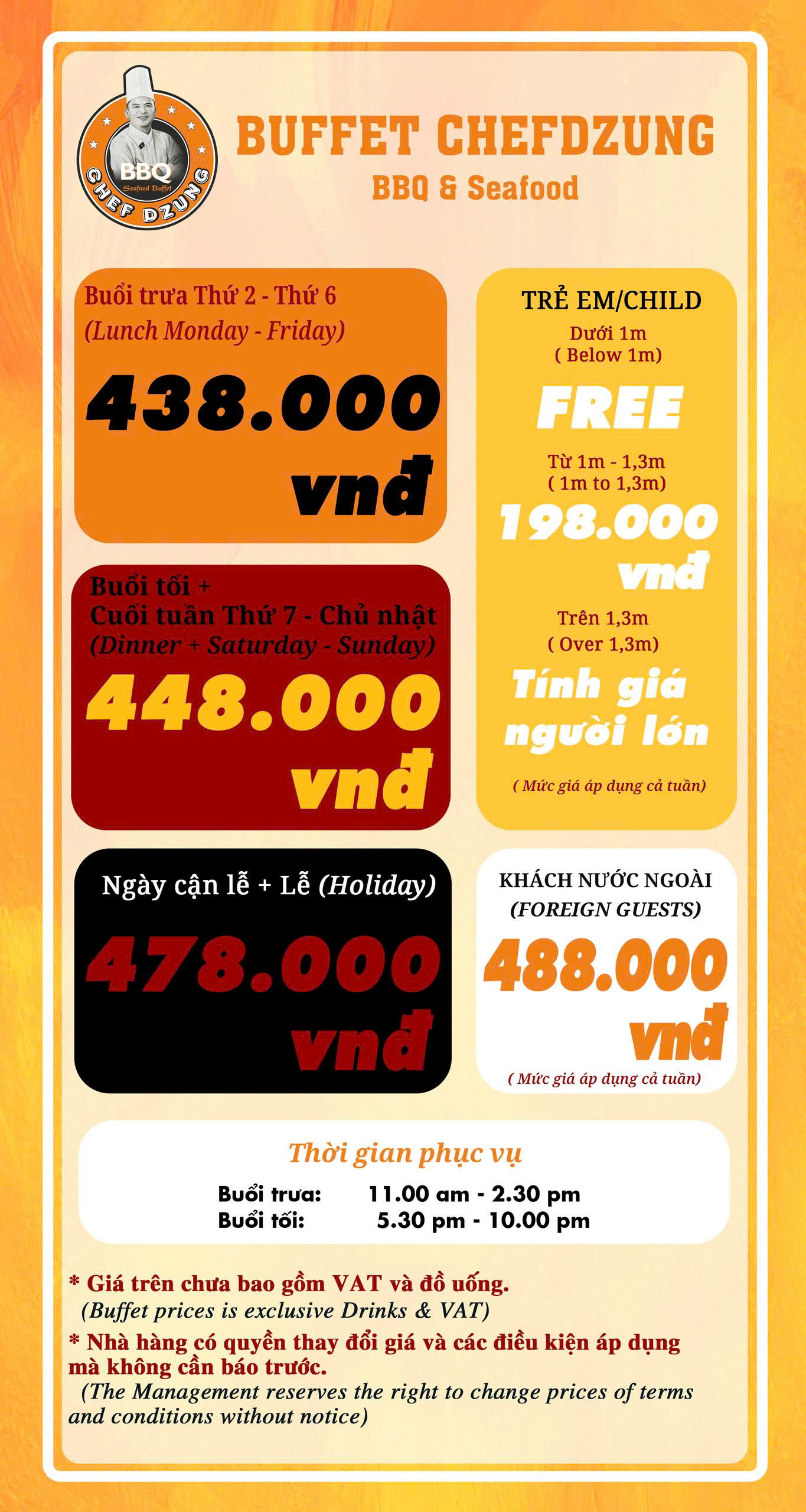 Nhà hàng Buffet Chef Dzung xin gửi tới quý khách hàng BẢNG GIÁ mới áp dụng từ 07.04.2026 như sau: